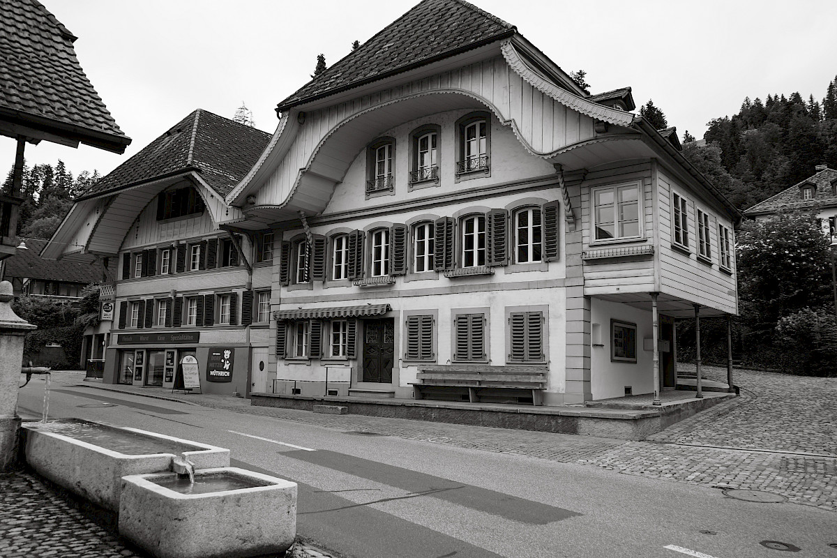 Vorzüglicher Putzbau mit geschweifter, abgesetzten Korbbogen-Ründi und Mansarddach. Unauffällig asymmetrische Fassade, ausgeprägt profilierte Gliederungselemente. Ostseitige Laube auf historischen Gusseisenstützen. Eingangsbereich in seltenem Terrazzo. Bildet mit der Front des Nachbargebäudes einen wichtigen Angelpunkt im Strassenbild des Dorfkerns. Lange Zeit von Notar Ferdinand Althaus, Notar und Gemeindeschreiber, bewohnt.