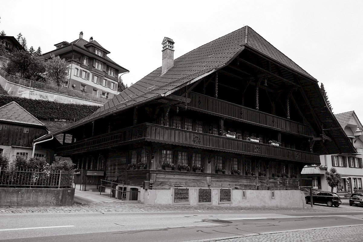Baudenkmal erster Güte, seltener Bautyp von hoher historischer Bedeutung. Erbaut von einem Tuchhändler. Die offene Bühne diente als Trocknungsraum für Textilien. Von 1901 bis 1968 im Besitz von Familie Moser, die in ihrer Messerschmiede Messer, Scheren und chirurgische Instrumente herstellte. Im Nebengebäude betrieb der Schwiegersohn Jakob Ryser eine Töpferei mit Brennofen. Das Haus wurde 1968 vom Berner Heimatschutz gekauft, stilvoll renoviert und 1974 an Private verkauft. Das Haus war bis zur Renovation mit Schindeln gedeckt.