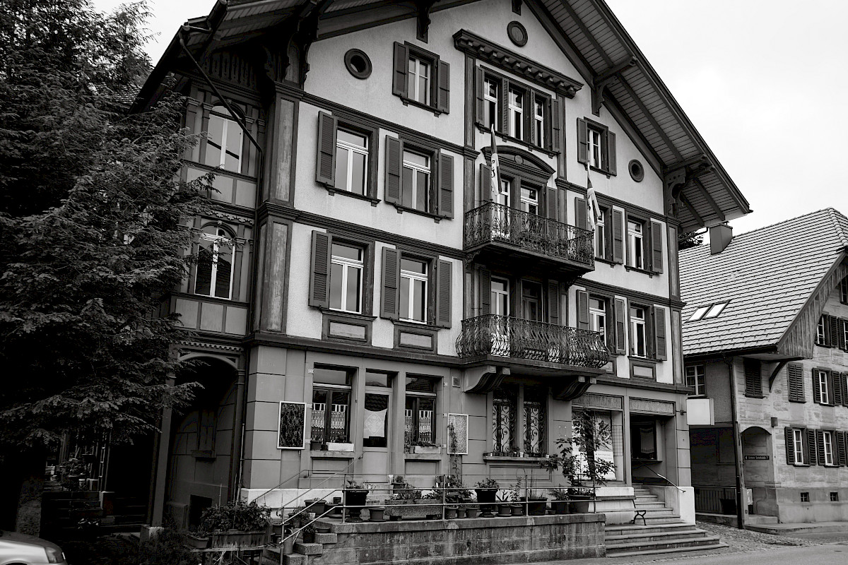 Ausserordentlich repräsentativer Bau von spätklassizistischem Habitus mit üppigen Fassadengliederungen im Sinn des Historismus. Reiche, farbig gefasste Holz und Kunststeinapplikationen, originale Haustür. Im Dorfkern einzigartiger, bemerkenswert rein erhaltener Bau.