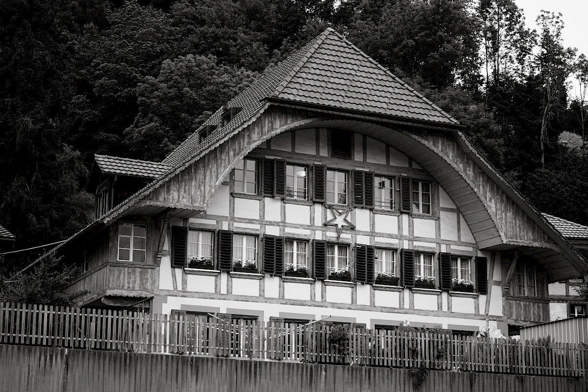 Spätbarocker Stock von äusserst repräsentativem Habitus. Zum Teil grau gefasstes unmerklich asymmetrisches Riegwerk; seitliche Lauben nachträglich geschlossen.